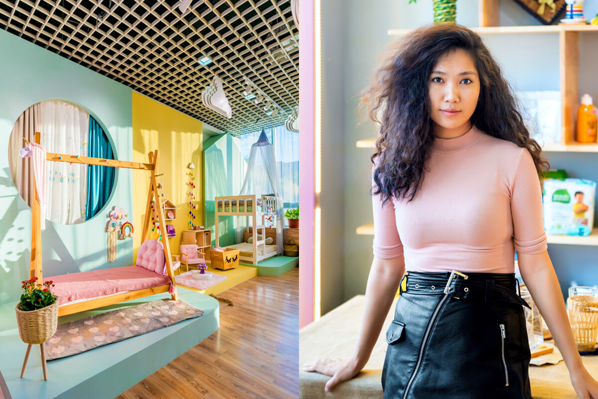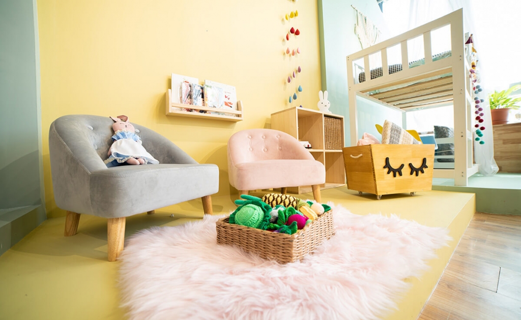 Монтессори тавилгын хэсэгт хүүхдийн өрөөний нэг талыг харуулахыг зорьсон бөгөөд 4 өөр өнгийн ханатайгаар хийгдсэн. Мөн тавилга болон бусад хэрэгсэл өөрчлөгдөхөд өнгө төрх нь дагаад хувьсах боломжтой. Шоүрүүмний гэрэлтүүлгийг нэмэх, орон зайд тайван уур амьсгалтай цогц шийдлийг бүрдүүлэхийн тулд үүлэн креатив унжуурга нэмсэн.