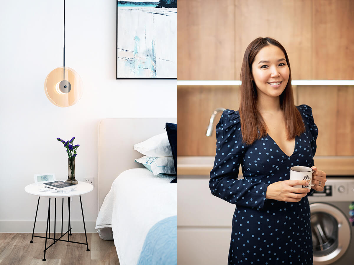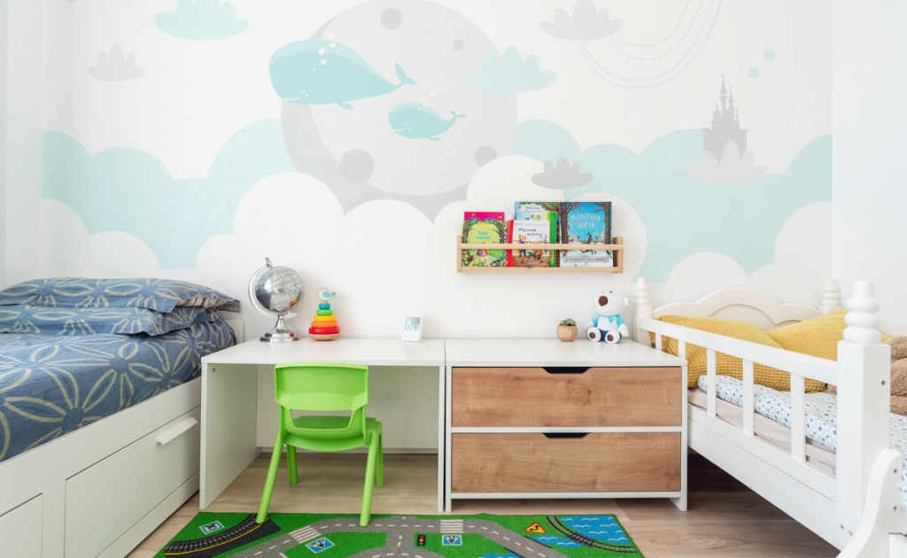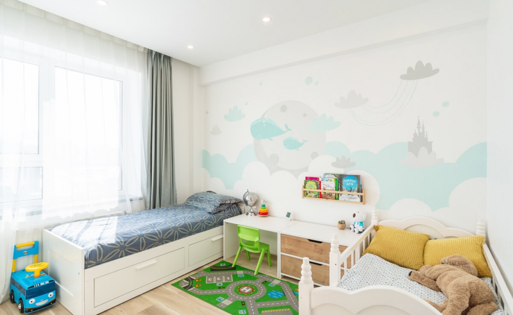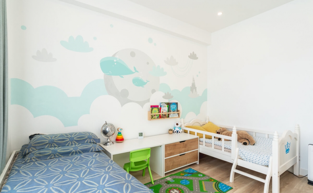 Хүүхдийн өрөөнд ерөнхий уур амьсгалтайгаа зохицуулаад ханан дахь зургийг Pinterest-ээс сонгоод зуруулсан. Хүүхдэд ээлтэй аль болох гэгээлэг өнгийг сонгосон бөгөөд тоглоомыг нь цэгцтэй байлгахын тулд шүүгээнд нь зориулж сүлжмэл сагснуудыг байрлуулсан. Нэг хэв маягийг тууштай дагнаж тохижуулахаас илүүтэй модерн шийдэл дээр бага зэргийн классик элемент оруулах гэх мэтээр тавилгуудаа сонговол сонирхолтой гэж боддог. Жишээ нь унтлагын өрөөнд байгаа классик хүрээтэй толь энэ өрөөнд их өвөрмөц чамин харагддаг юм.