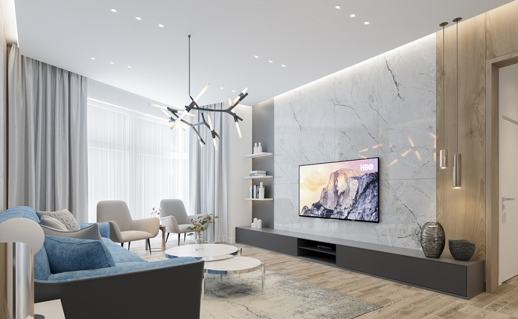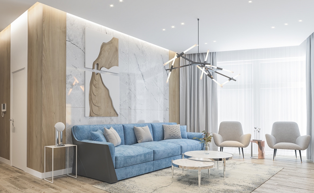 Орчин үеийн сонгодог хэв маягийг илтгэгч мод, чулуу зэрэг байгалийн материалуудыг цайвар завсрын өнгөтэй уялдуулан ашигласнаар интерьерт байгалийн уур амьсгалыг оруулж, хөнгөн мэдрэмжийг өгч байна. Зочны өрөөний хэсэгт хараа булаам өнгө нэмж байгаа буйданг дурьдахгүй өнгөрч болохгүй. Цулгай эсвэл нэгээс нөгөөд ууссан зөөлөн өнгөтэй суурин дээр анхаарал татахуйц тавилга байршуулах нь гэрийн интерьерт төгс зохицдогийг нуух юун.