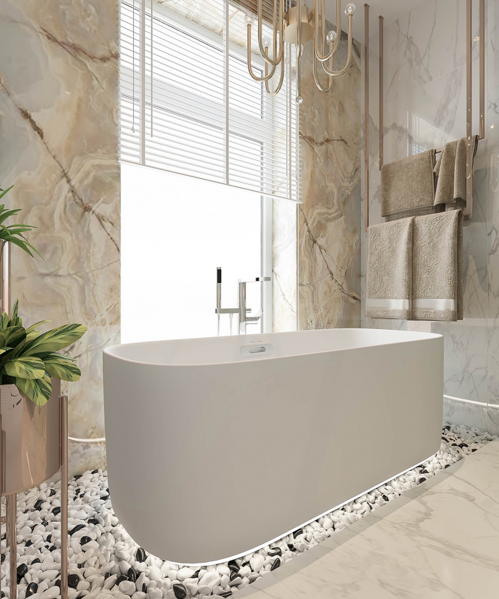 Байгалийн чулуун хана – цагаан хайргаар дүүргэсэн ванны хэсэг – тасалгааны ургамал.