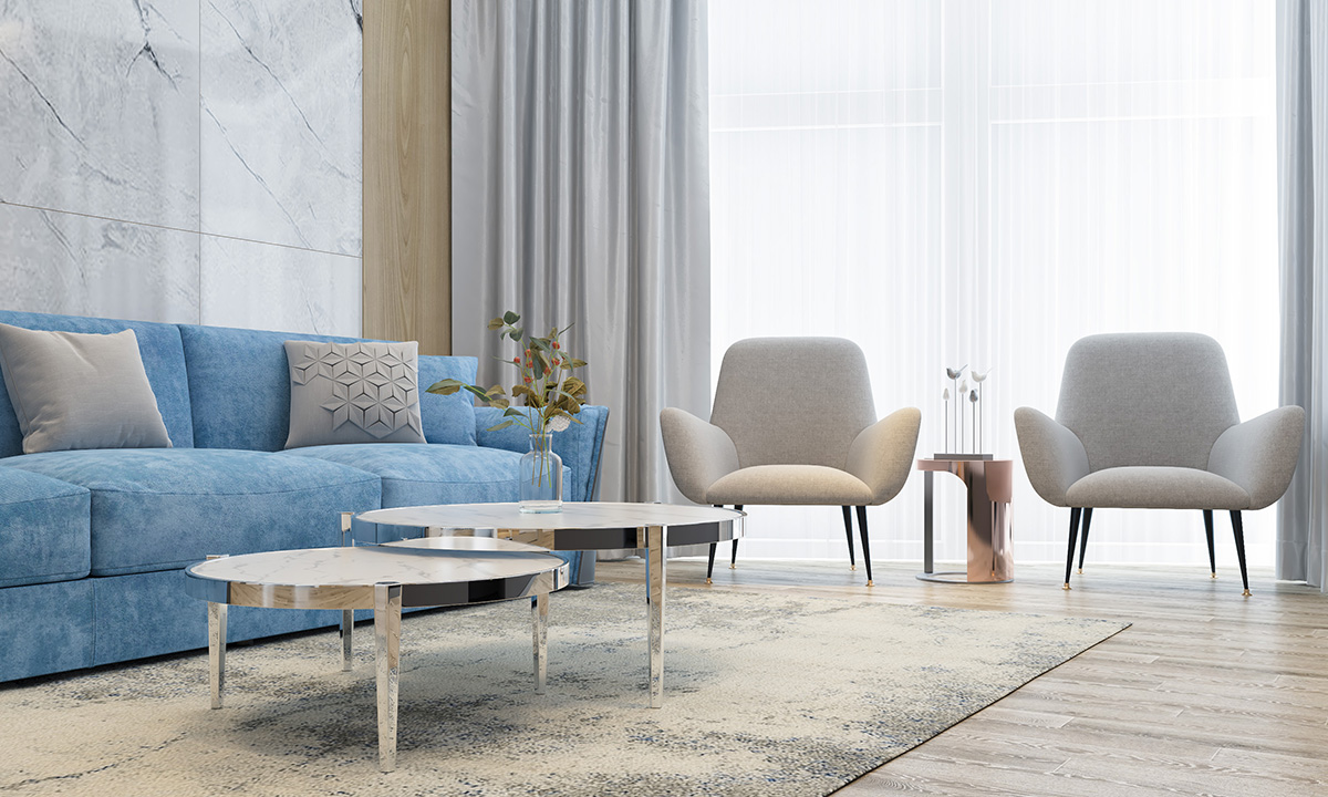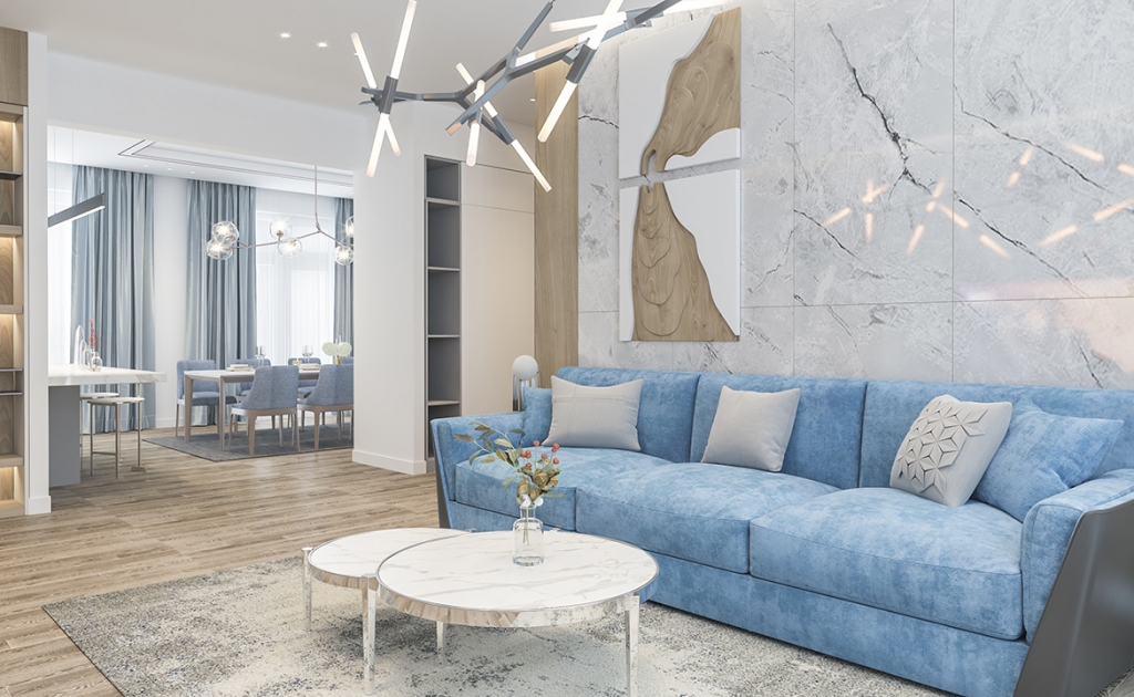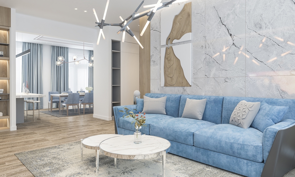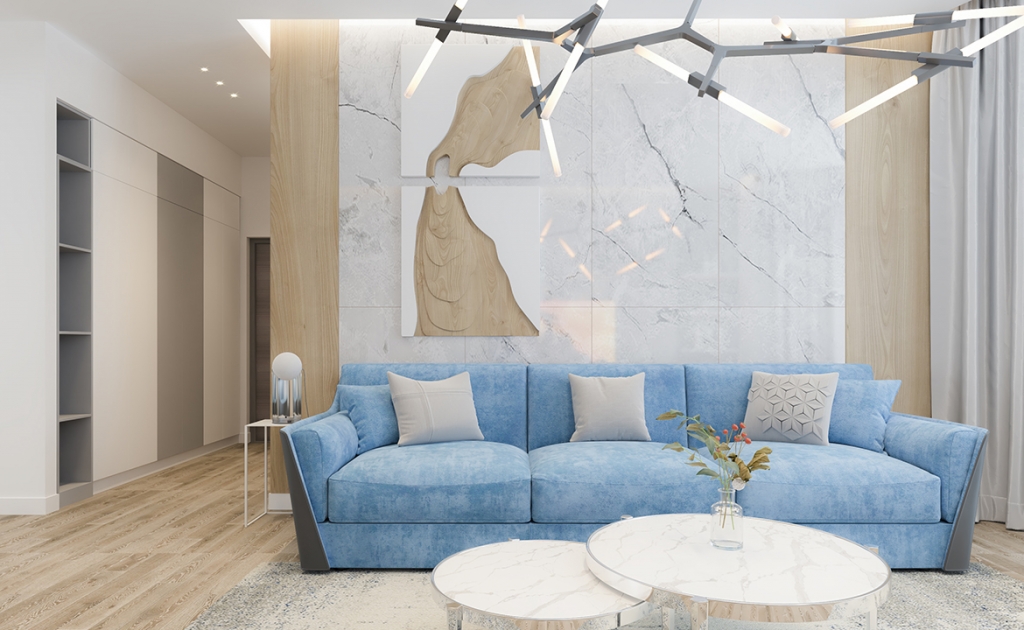 Дотоод орчны тохижилтод ямар өнгө зонхилж байгаагаас шалтгаалан өрөөний уур амьсгал, амьдрах орчноос авах мэдрэмж өөр өөрөөр тодорхойлогддог. Номин цэнхэр өнгийг ашигласнаар гэрт сэтгэл сэргэм, тайван уур амьсгалыг бүрдүүлж болдог. Гэрийн ерөнхий интерьерийг бүхэлд нь харвал цэлгэр саруулхан, тав тухыг шууд л мэдэрч болохуйц. Илүү сайн ажиглавал номин цэнхэр болон цагаан саарал өнгө зонхилсон нь цагаан элстэй хөх тэнгисийг тольдож буй мэт сэтгэгдэлийг гэрийн эзэнд төрүүлэх нь лавтай.