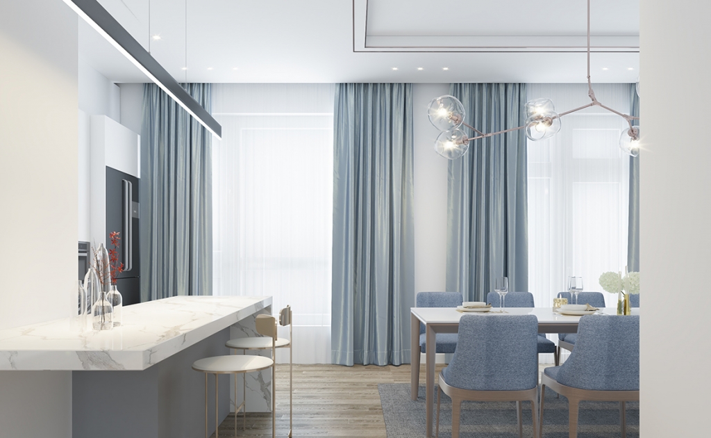 Тэнгисийн үзэсгэлэнт эрэг дээр тухлан хооллох мэт боломжийг өдөр бүр интерьерээсээ мэдэрч яагаад болохгүй гэж? Үзэсгэлэнтэй, маш цэмцгэр, бас саруулхан орчинд хооллох нь юутай ч харьцуулашгүй дээд зэргийн тав тух. Тансаг цэмцгэр байлгах гэж хичээн ажилласныг ашигласан деталь бүрээс нь анзаарч болно.