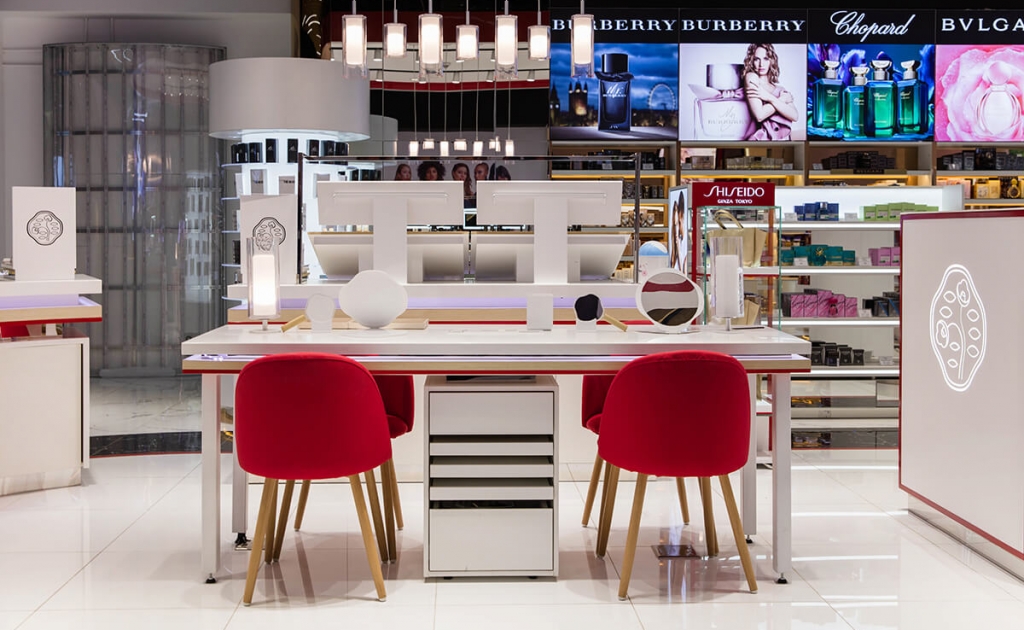 Таазан дээрх үргэлжилсэн хөндлөн хэлбэртэй хавтангууд болон шулуун гэрлийн хоршил тун содон. Дэлгүүрийн заланд гоо сайхны мэргэжилтнээс зөвлөгөө авч, үйлчлүүлэгчийг өөртөө тохирох энгэсэг сонгоход туслах хэсгүүдийг хүртээмжтэй шийдэж өгснөөр тус дэлгүүрийг зорих бүсгүйчүүдийг улам татна. Энэ нь орон зайн зөв хуваарилалт билээ.