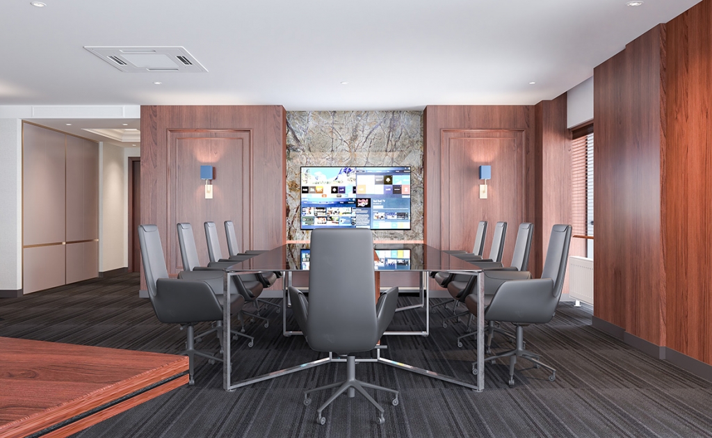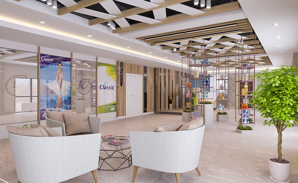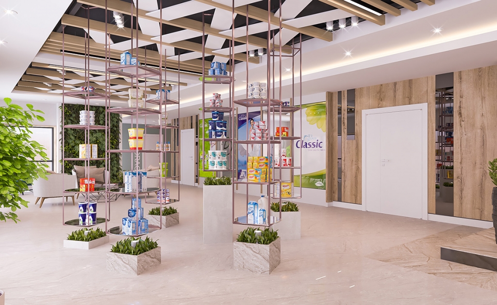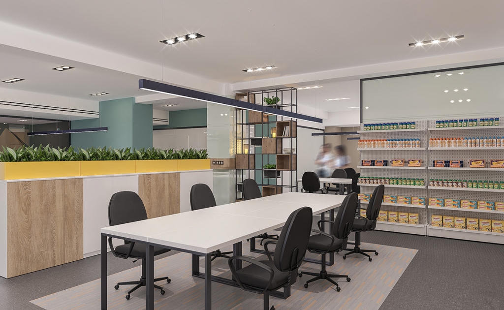 Мөн бүтээгдэхүүн сурталчлах хэсэгт навчит ногоон хана болон тасалгааны ургамлыг шийдэж өгсөн нь брендийн үнэ цэнтэй зориуд тохируулсан мэт.Ажилчдын цайлах өрөөнд харин эрч хүч урам өгөх үгсийг ханан дээр байрлуулсанаар сүүлийн үеийн оффисуудад ашиглагдаж байгаа трендийг хэрэгжүүлжээ. Ийм тухтай орчинд ажлын амжилт гарах нь эргэлзээгүй бизээ.