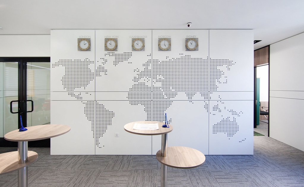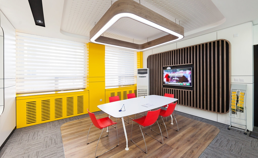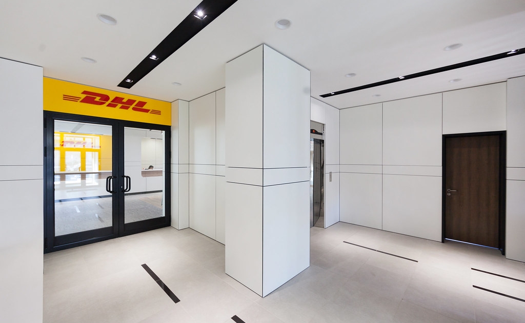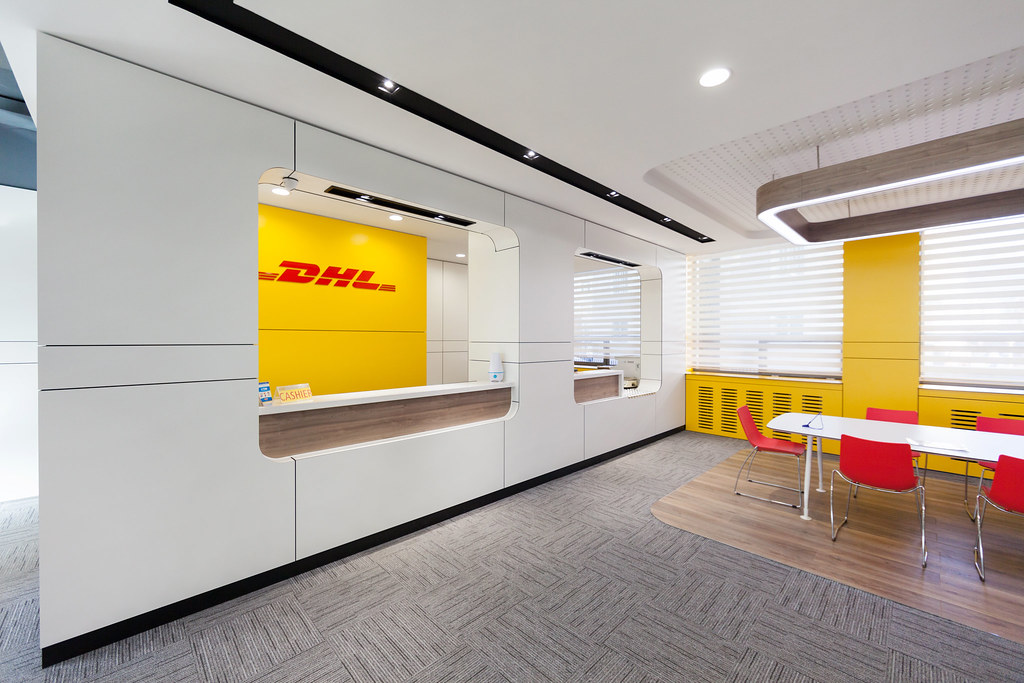 DHL брендийн утга илэрхийлэлтэй төгс хослуулан интерьер дизайны шийдлийг гаргаж, Fundermax доторлогооны хавтангаар өнгөлж гүйцэтгэв. Ерөнхийдөө завсрын суурь өнгийг голчлон ашигласан бөгөөд хараа булаам төв хэсэгт логоны өнгө дагуу жижиг деталиудыг шингээсэн. Шар болон улаан өнгөний хурц тод байдлыг зөөллөж завсрын өнгөөр суурь өнгөө бүрдүүлсэн нь тохиромжтой сонголт болсныг уншигч та дараах зургуудаас харж болно.