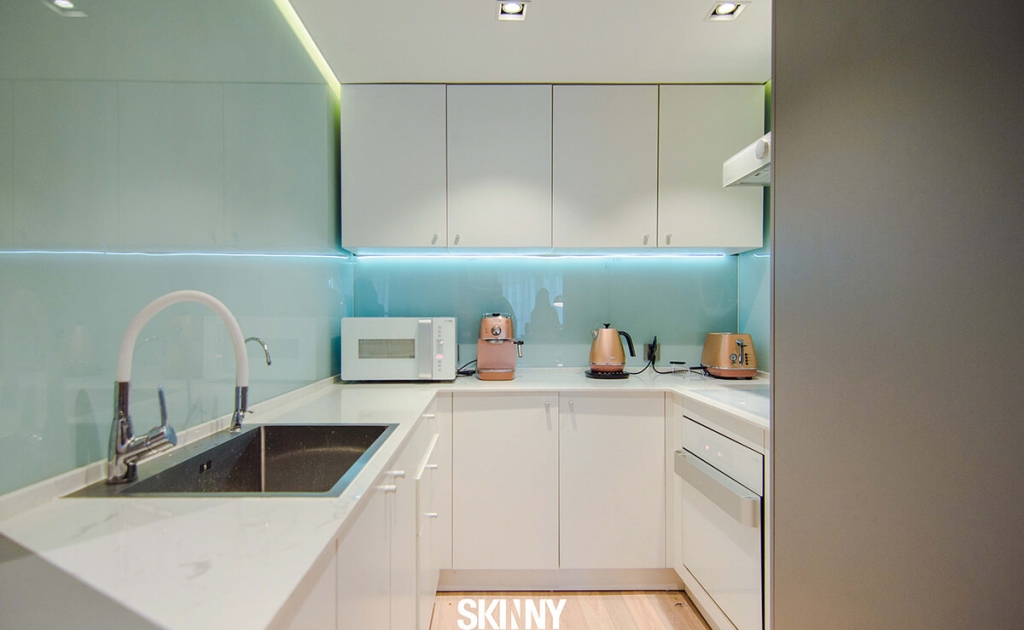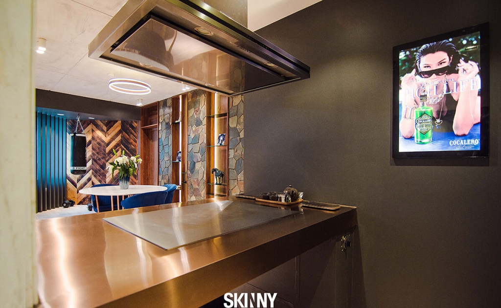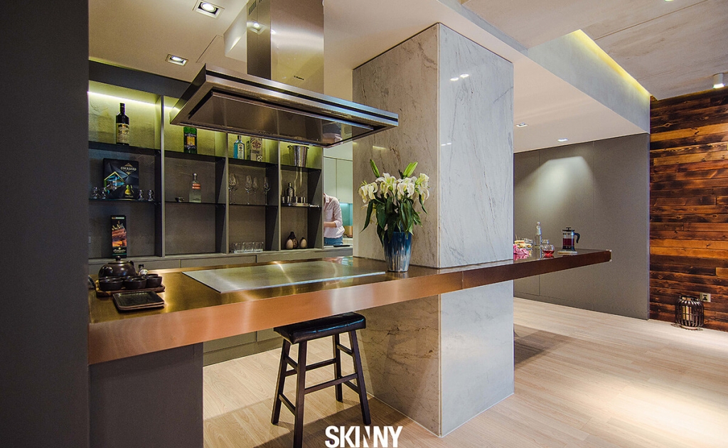 Шалнаас хөндий мэт гал тогооны тавцан нь орон зайг том цэлгэр харагдуулна. Харин чулуун хана нь аль нэг үзэсгэлэнт шилтгээнийг санагдуулам нууцлаг бөгөөд сүрлэг.