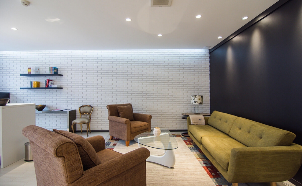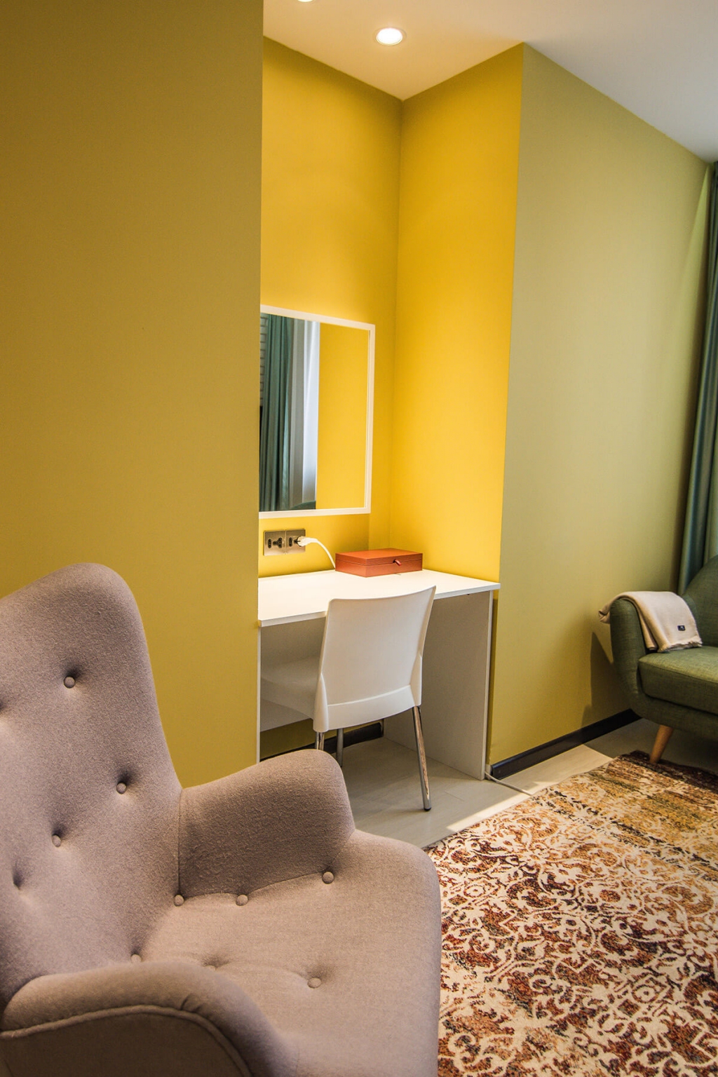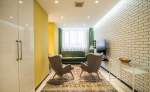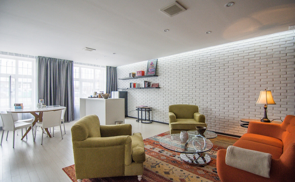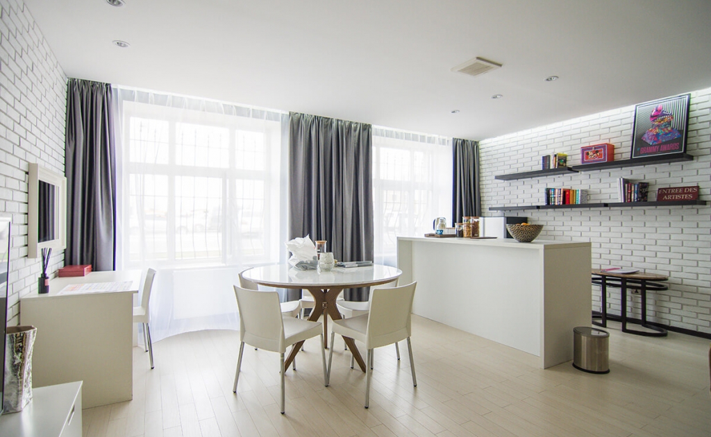 Бичлэгт орохын өмнөх бэлтгэл болон бичлэгийн дундуур амрахад зориулагдсан эл өрөө нь цэмцгэр бөгөөд тохьтой. Интерьерийн цагаан суурин дээр тухайн үеийн тренд өнгөтэй  зөөлөн эдлэл болон чамин декоруудаар тун ч донжтой “тоглолт” хийсэн байна.