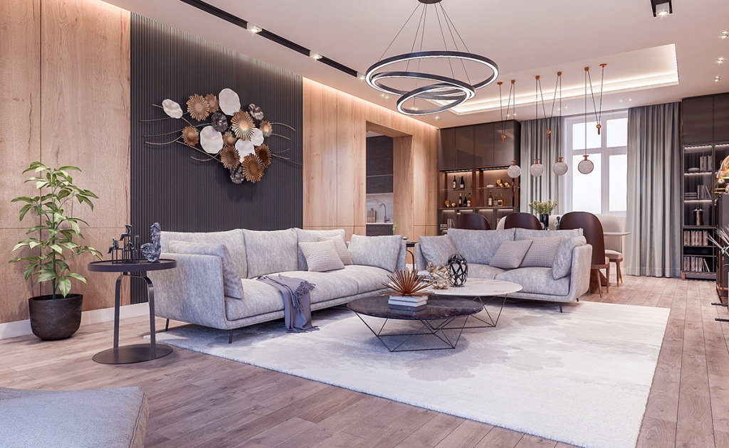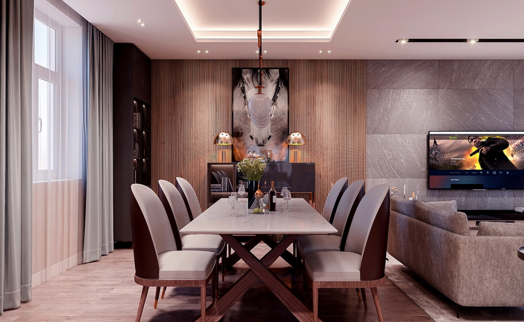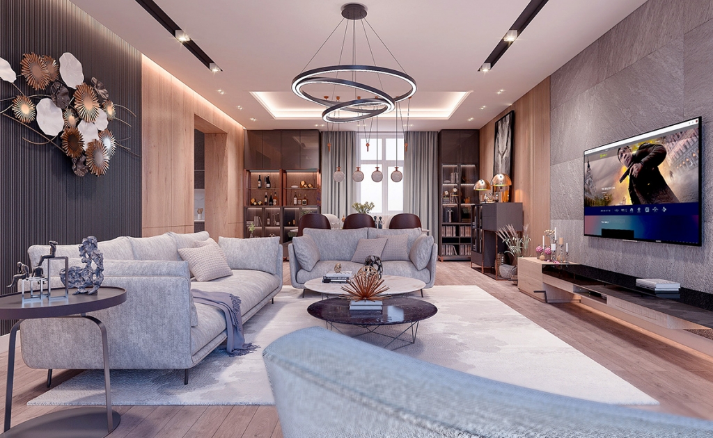 Энэхүү байшингийн интерьер бүхэлдээ цайвар өнгөөр дагнасан бөгөөд ингэхдээ нэгээс нөгөөд ууссан завсрын зөөлөн өнгө сонгон ашигласан нь учиртай. Ийм өнгөнүүд сэтгэл санааг тайвшруулж, амраахаас гадна аюулгүй мэдрэмжийг өгдөг. Жинхэнэ тав тухыг мэдрүүлэх маш тансаг сонголт бол зөөлөн өнгөнүүд юм.