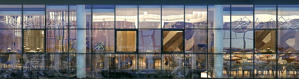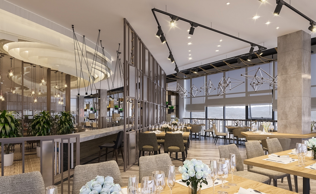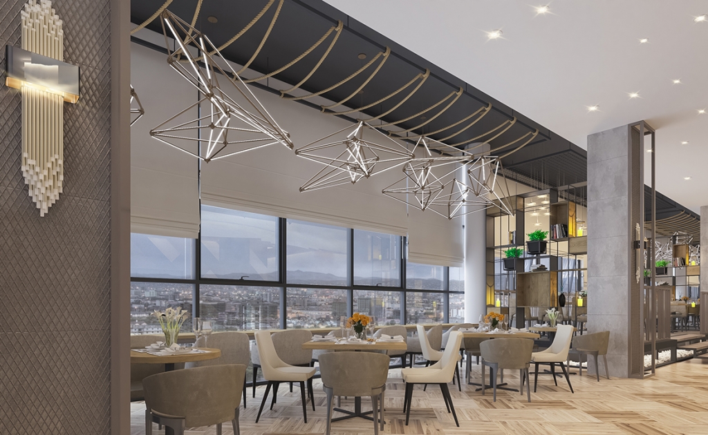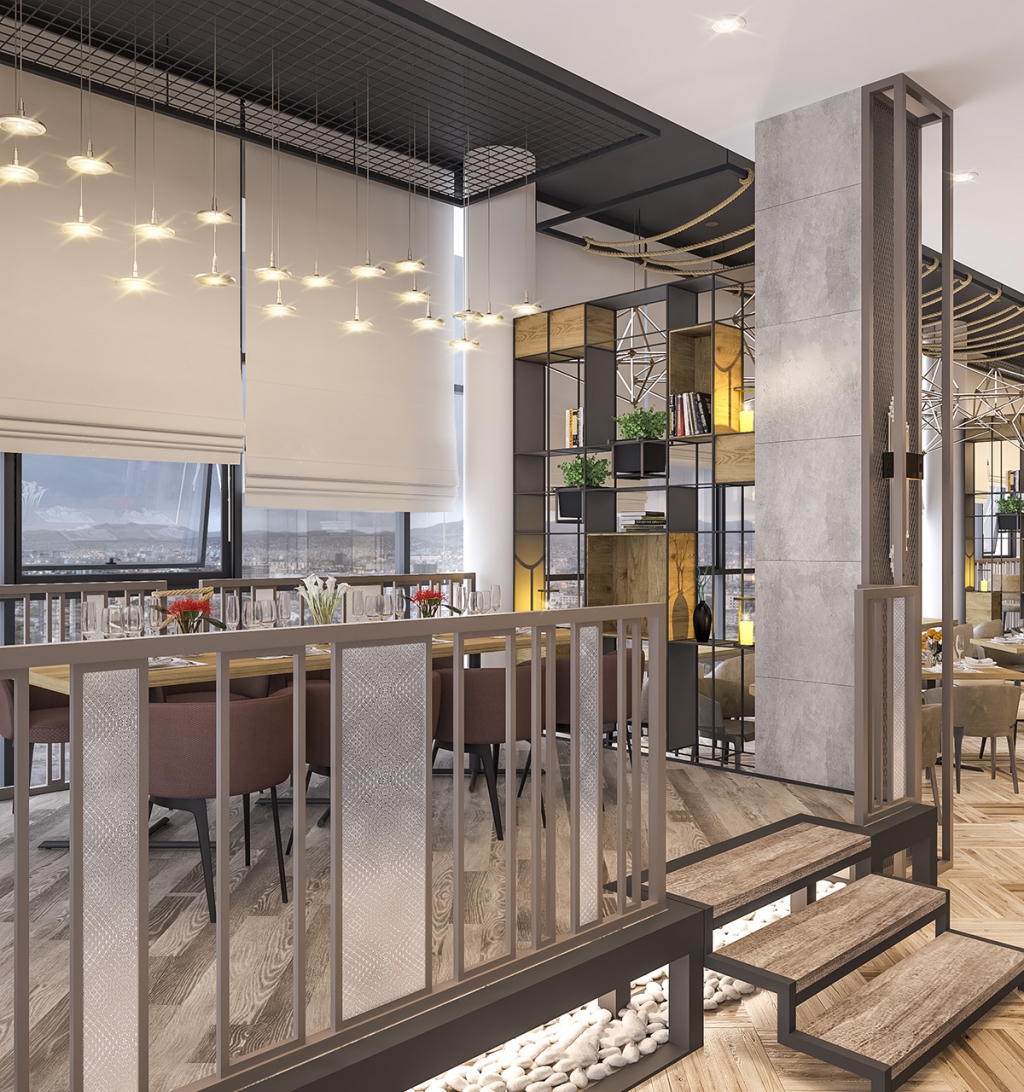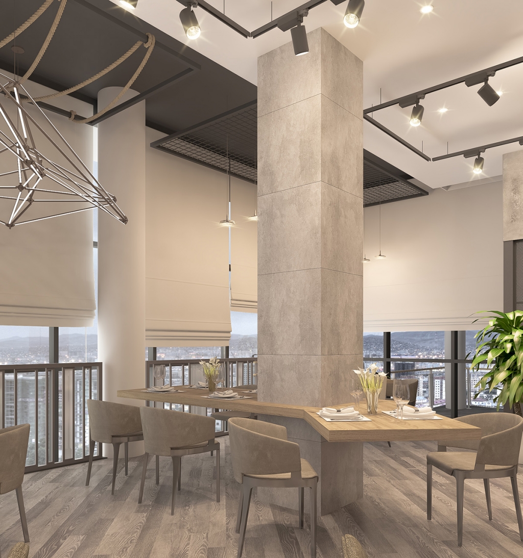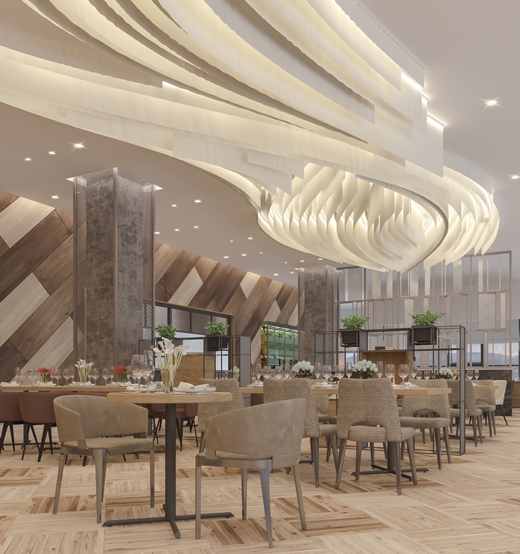 Таазны дундуур үүл мэт маш сонирхолтой шийдэл бүхий гэрэл орчныг бүхэлд нь онцгой уур амьсгалтай болгоно. Тухайн орчин нь бүх талаараа цонхтой буюу өдрийн турш байгалийн гэрэл саадгүй тусч байхаар төлөвлөлттэй байна. Иймд цайвар өнгийг суурь болгосноор илүү цэлгэр харагдах ба үүлэн дээр хөвж буй мэт романтик сэтгэгдлийг төрүүлнэ. Энэ нь магадгүй рестораны үнэ цэнийг улам өсгөж буй.
